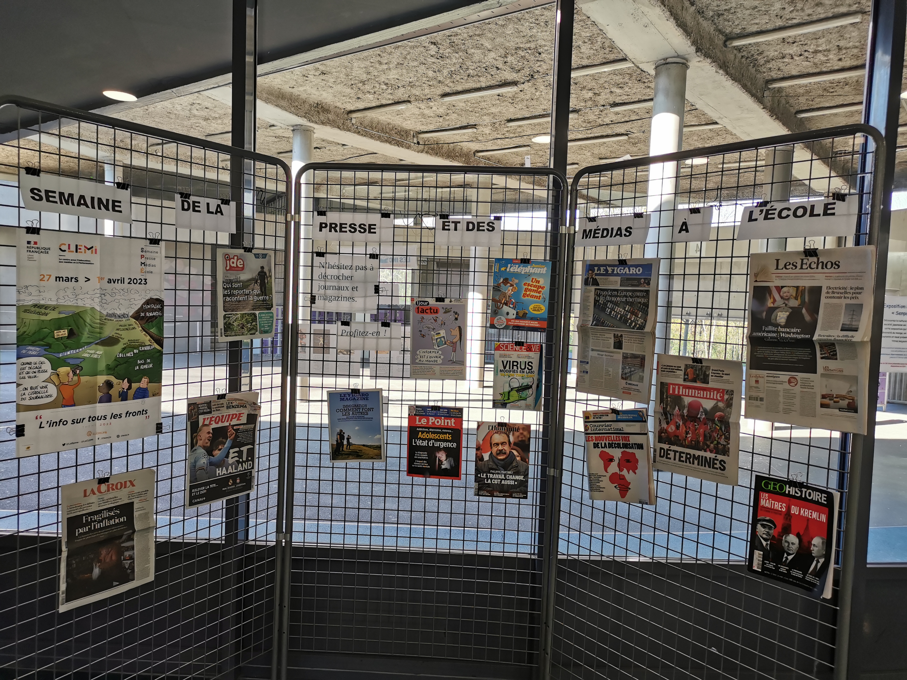 Suite à l’inscription du collège sur le site du CLEMI, nous avons reçu une trentaine de journaux et magazines. Nous avons ainsi pu dresser un kiosque en libre-service dans le hall.